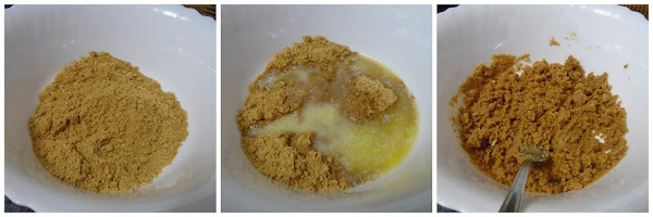 Una vez que las tengamos trituradas las pasamos a un bol y añadimos sobre ellas la mantequilla fundida, que la fundiremos en el microondas o en un cazo, previamente.