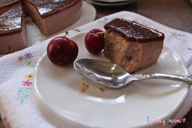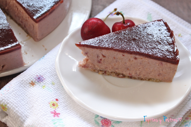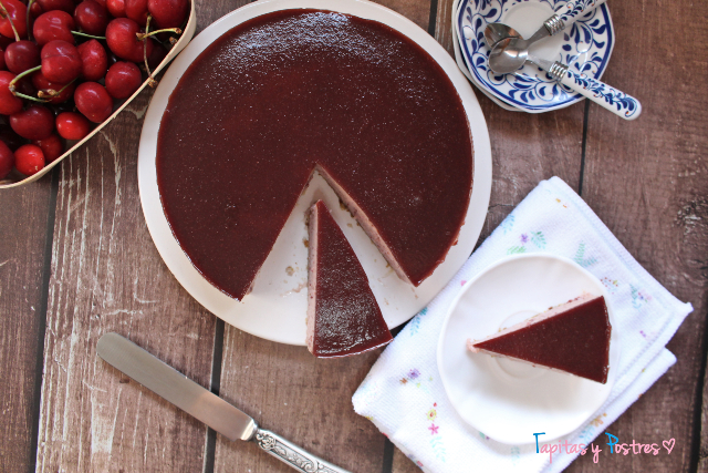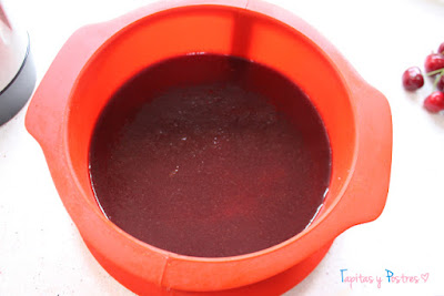 Entonces preparamos la cobertura. Trituramos las cerezas 20 segundos a velocidad 4. Mezclamos con el zumo de limón y el agua y calentamos unos cuatro minutos a 90º y velocidad 3. Mientras ponemos una hoja de gelatina a hidratar y cuando pasen los cuatro minutos la agregamos y mezclamos 20 segundos a velocidad 3. Aquí hacemos igual que con la crema. Probamos y agregamos estevia al gusto o no. La vertemos sobre la crema que debe estar cuajada y dejamos enfriar unas horas. Mejor de un día para otro.