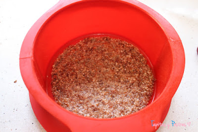Ponemos la mezcla en el fondo de un molde desmoldable ligeramente engrasado. Mi molde es de 18 cm. Lo reservamos en el congelador una media hora.