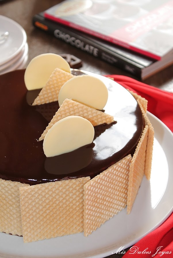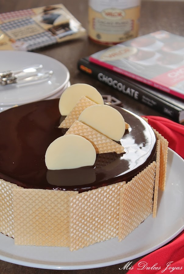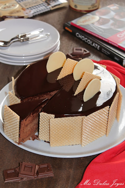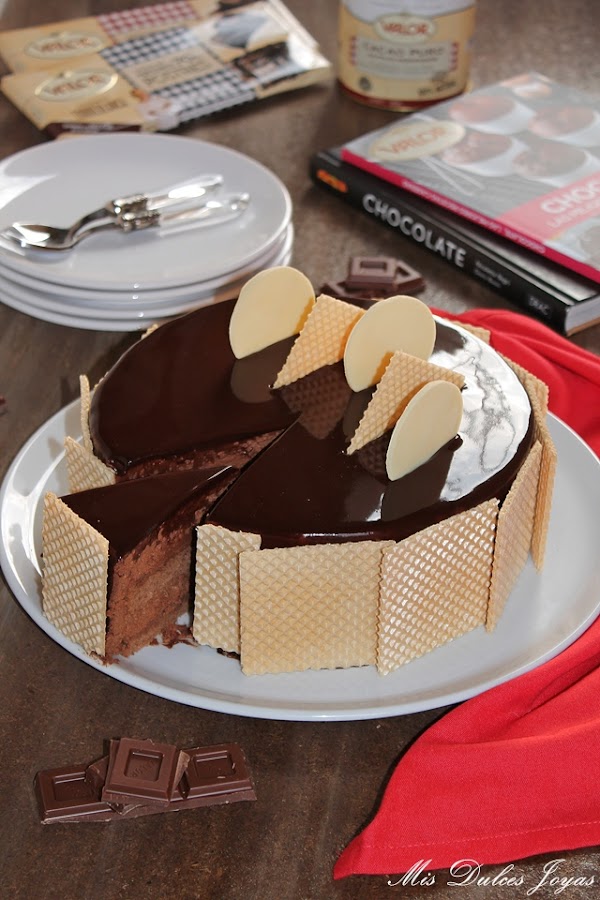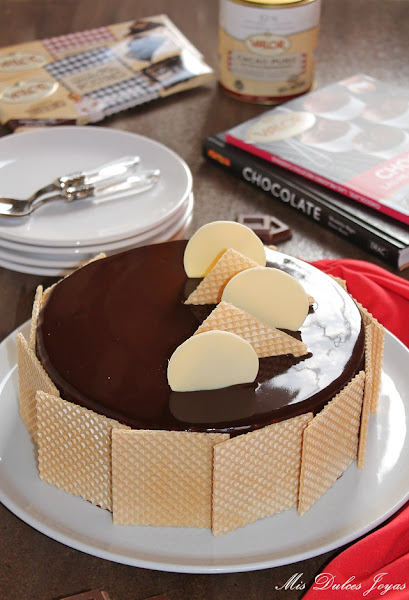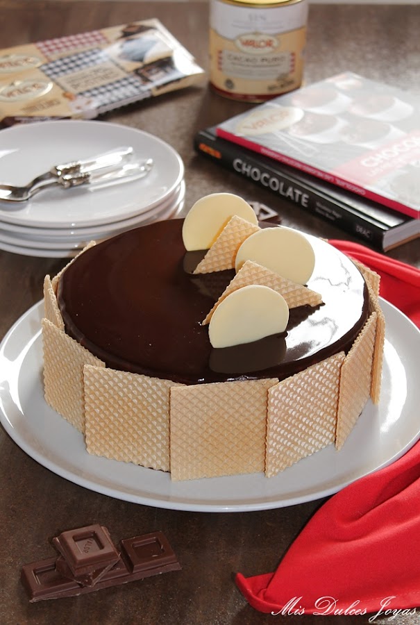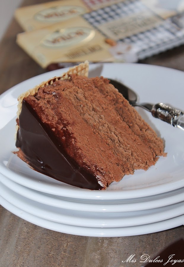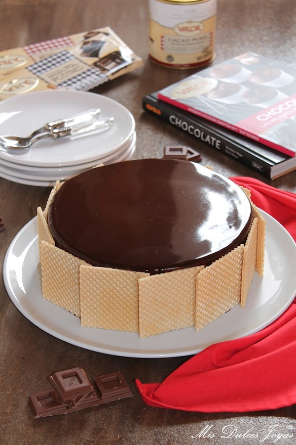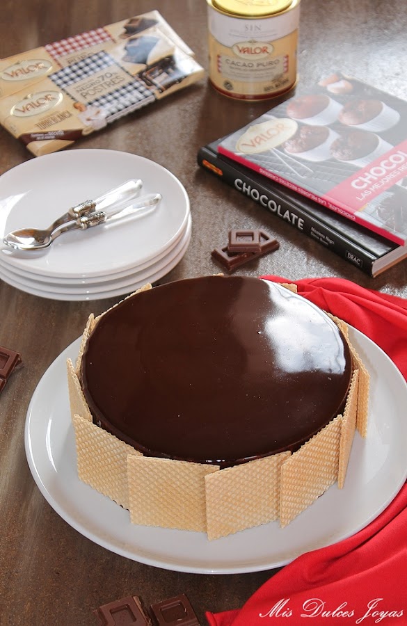 Cabe destacar que esta tarta si se elabora con chocolate sin gluten, como en este caso (con el chocolate puro y chocolate negro 70 % de cacao, de la marca Valor) se convierte en una tarta sin gluten, apta para todas aquellas personas que padecen alergia o intolerancia al gluten. Yo, la he decorado con unas obleas clásicas, me refiero que están elaboradas con harina de trigo, de ahí que no os he puesto en el título - sin gluten- pero perfectamente se puede decorar con unas virutas de chocolate, frutos secos o azúcar perlado, y de esta forma, se convierte completamente en una tarta apta para celiacos. Este es otro punto a favor para esta tarta, que la hace ideal para fiestas infantiles, ya que en las fiestas casi siempre suele haber algún niño con alergias o intolerancias alimenticias. Espero que os guste !!!!