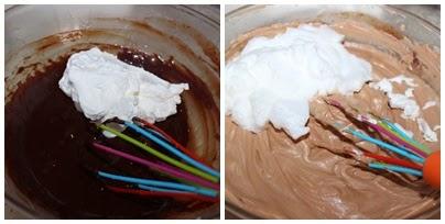 Añadimos la nata (crema de leche) poco a poco mientras mezclamos con cuidado. Por ultimo añadimos la clara montada con movimientos envolventes.
