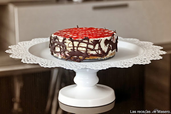 La receta es una suma de varias ideas de diferentes blogs. Tomé la base prestada del blog "mrmlada" que tiene unas recetas estupendas y la mousse de chocolate blanco de la web "cocinisima". El molde que usé fue desmontable de 15 cm de diámetro y de 7 cm de altura.