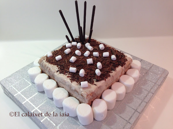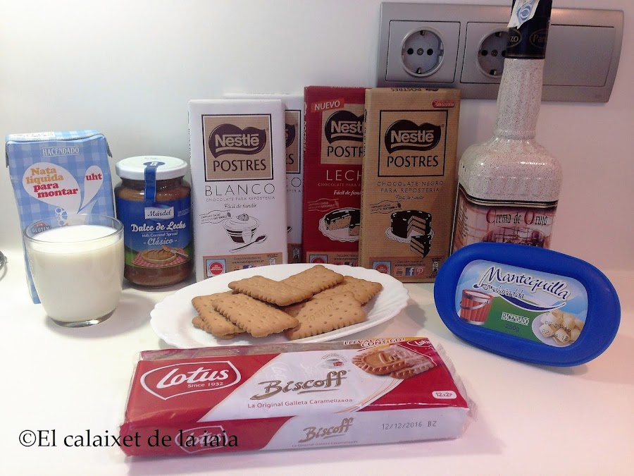 Ya os he dicho en varias ocasiones que ni al mayor, ni al pequeño, les gustan las tartas con bizcocho, con Víctor no hay problema, siempre quiera la tarta tradicional de galletas con chocolate puro, pero a Pau, no le gusta el chocolate puro y cada año suelo hacerle una tarta nueva. A mi nuera le encanta el chocolate blanco y el dulce de leche, así que para celebrar su cumple y dar gusto a los dos, que nos invitaron junto con su iaio a comer....todo un lujo ;), preparé ésta tarta que salió deliciosa de sabor pero para nada con el aspecto que tenía pensado y luego os explico porqué....