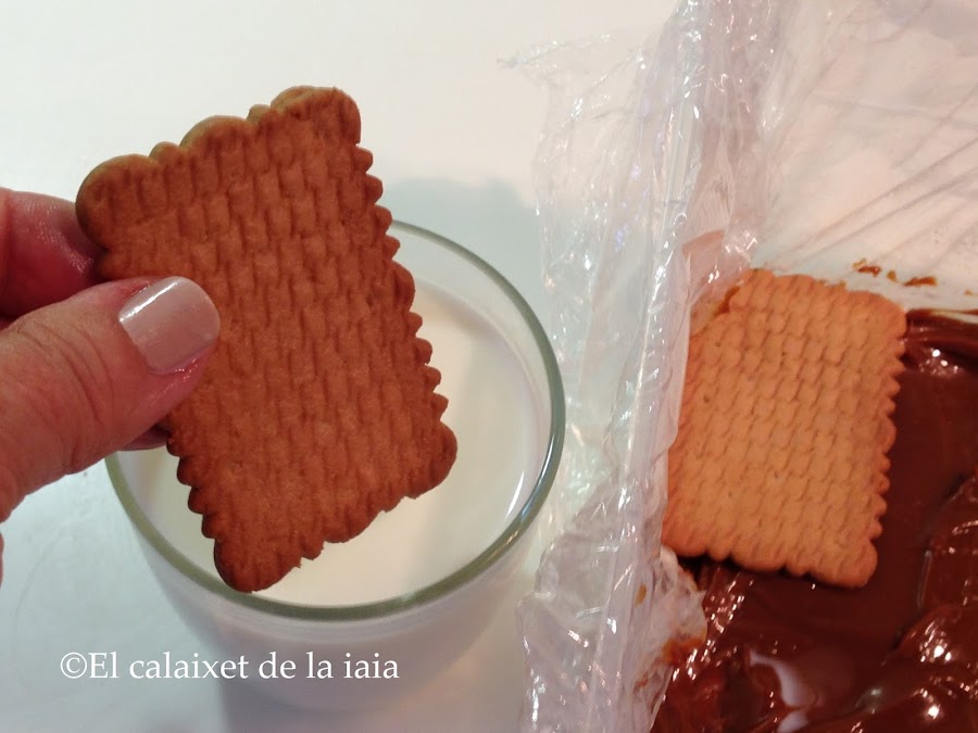 el siguiente paso será poner sobre la capa de dulce de leche una de galletas mojadas ligeramente en leche, solo introducir la galleta y sacar al instante, porque de lo contrario se deshace toda la galleta, formándose una pasta que no sirve para nada