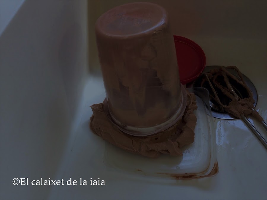 y ahora es cuando ha ocurrido otro desastre. He sacado la ganache del frigo y por lo visto sin darme cuenta, he empujado el bote abierto que ha caído dentro de la pila.....cuando me he dado cuenta ya era tarde ¡¡¡ooooh noooooo!!! se ha desparramado la ganache, cayendo sobre agua con jabón ya que hacía un momento había fregado una espátula....con lo cuál solo he podido aprovechar la ganache que quedaba dentro del tarro. Los nervios...la preocupación y la noche sin dormir