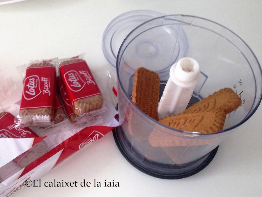El siguiente paso, será triturar nuestras galletas especuloos o galletas caramelizadas que podemos encontrar en culquier supermercado comercializadas con la marca Lotus, son unas galletas especiadas y caramelizadas que alguna vez he preparado en casa. La proxima vez que las haga, tomaré fotos y subiré la receta porque son riquísimas y podemos hacer una buena hornada por muy poco dinero.