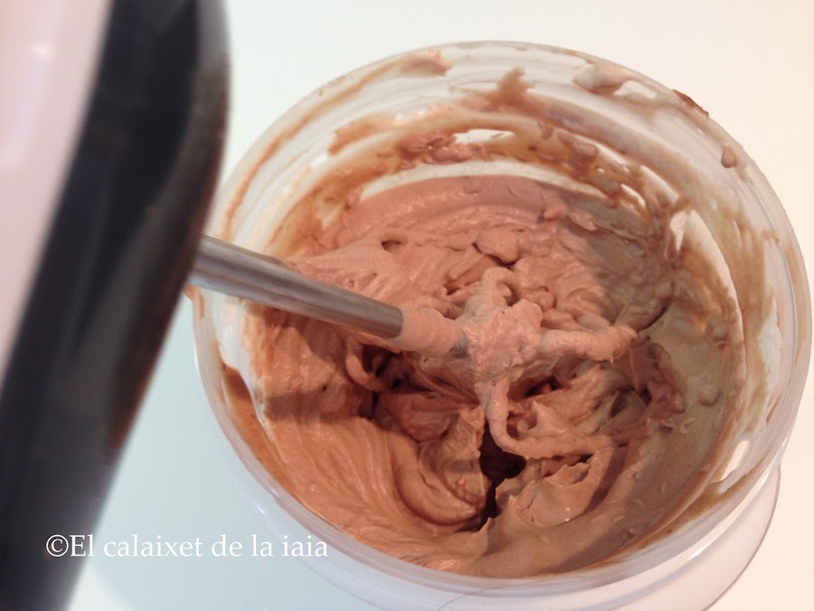 mientras tanto podemos montar la ganaché que hicimos ayer, para que coja la textura que necesitamos para cubrir la tarta. Una vez montada la volveremos a introducir en la nevera y la dejaremos allí, bien escondida que no la descubra nadie (risa brujeril), hasta el momento de terminar la tarta