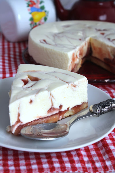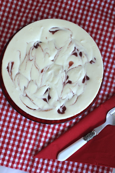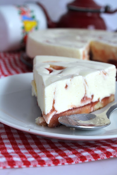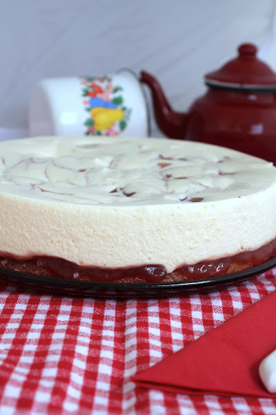 12. Por último, montamos la tarta poniendo la base de bizcocho en el molde limpio, ponemos una capa de mermelada de fresa bien extendida y encima añadimos la mezcla de la mousse, alisando bien la superficie. Con una cucharita, ponemos un poco de mermelada en la superficie y con un tenedor removemos para formar "dibujos".