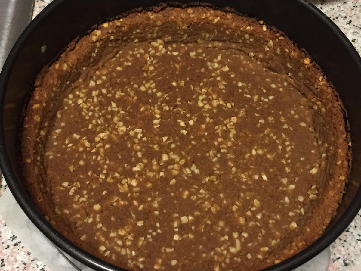 La descubrí en una revista de postres, y nada más verla, la marqué como pendiente Me gusta mucho la base que se utiliza, la típica de galletas y mantequilla fundida, pero añadiendo almendra en granillo y esencia de vainilla, brutal! Sin duda, la incorporaré para futuras recetas.
