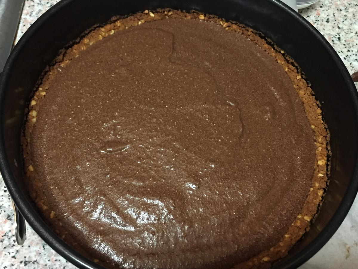 11. Vertemos la mousse sobre la base de galletas y nivelamos si es necesario la superficie con una espátula. Tapamos con papel film y reservamos en la nevera durante mínimo 4 horas, aunque lo mejor es dejarlo de un día para otro.