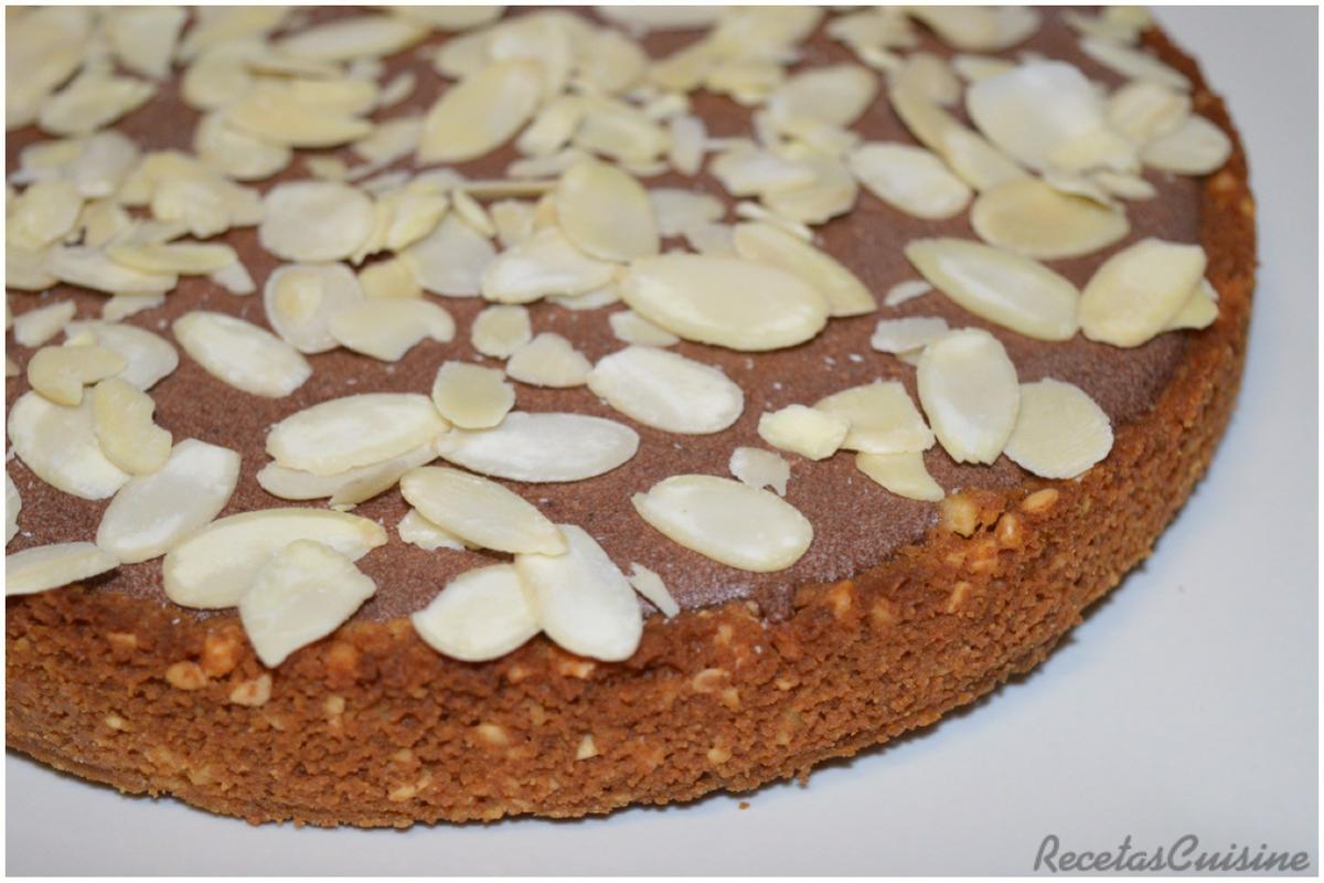 12. Cuando vayamos a servir la tarta, desmoldamos con cuidado, si hace falta pasamos el filo de un cuchillo para despegar la base de galleta de la pared del molde, y repartimos almendra fileteada por toda la superficie.