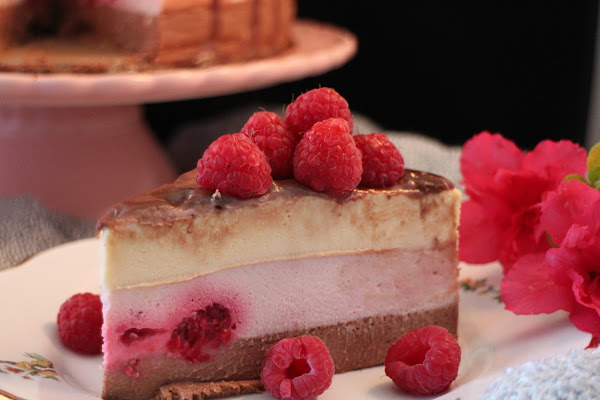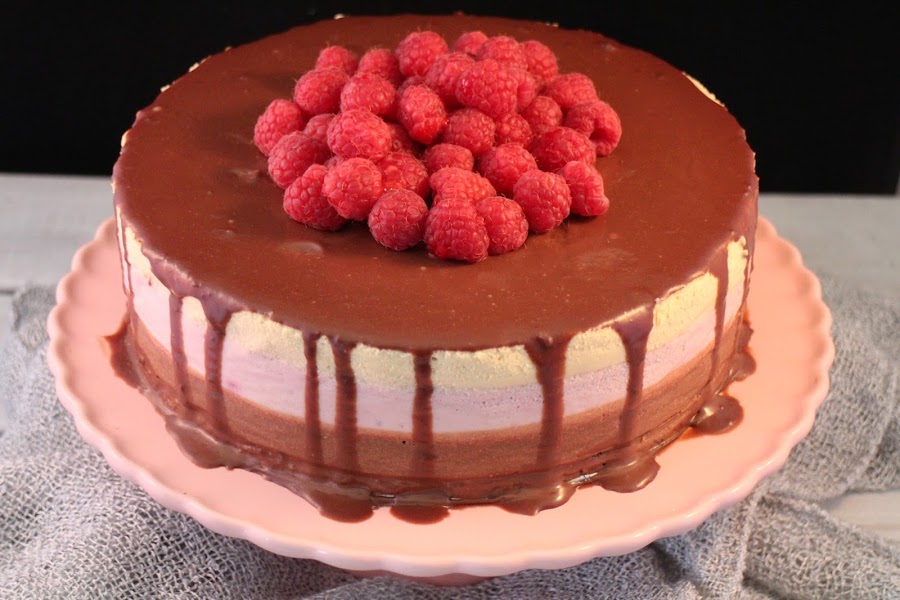 Parecida a la tarta tres chocolates, incorpora fruta en la capa de frambuesas y sustituye el chocolate negro por miel y vainilla en la última capa.