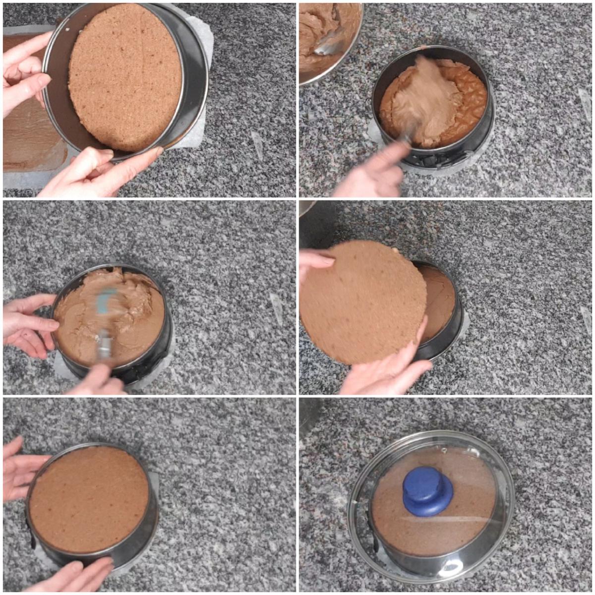 Montar la tarta Cortamos los bizcochos a las medidas del molde que vayamos a utilizar, utilizaremos dos, uno de base u otro de tapa. Colocamos el bizcocho base, y rellenamos con la crema de chocolate, intentando que quede pareja, y cerramos colocando el otro bizcocho como tapa. Reservamos en la nevera como mínimo 4 horas.