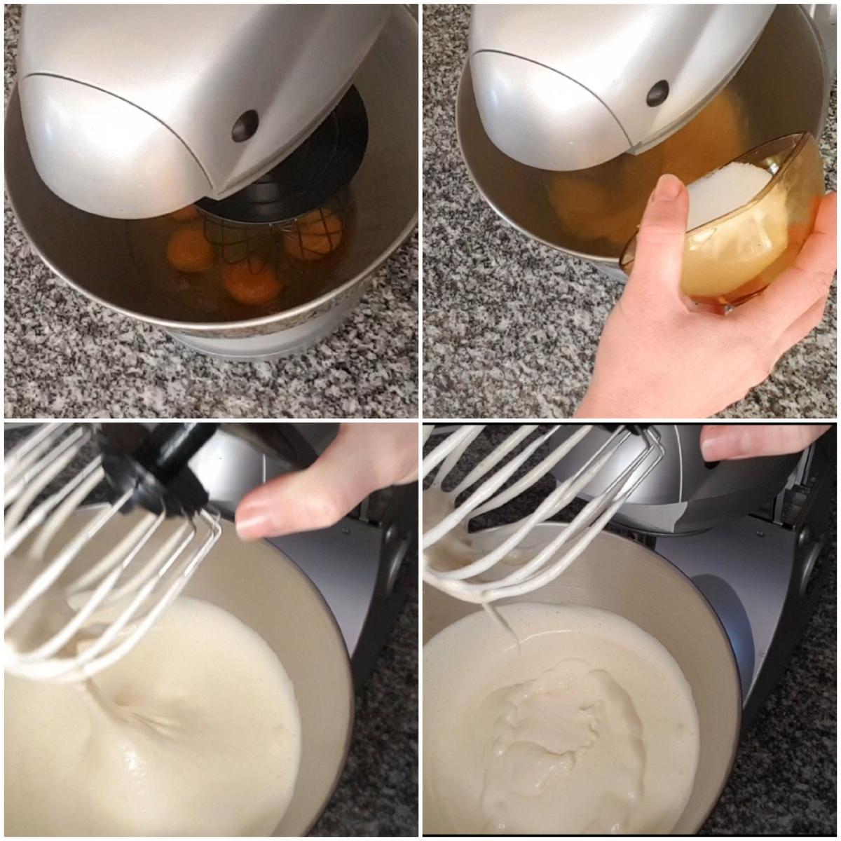 Tiempo necesario: 1 hora.Precalentamos el horno a 180ºC Precalentamos el horno. Batimos los huevos con el azúcar a máxima potencia hasta que tripliquen su tamaño y que tenga textura de punto de letra.