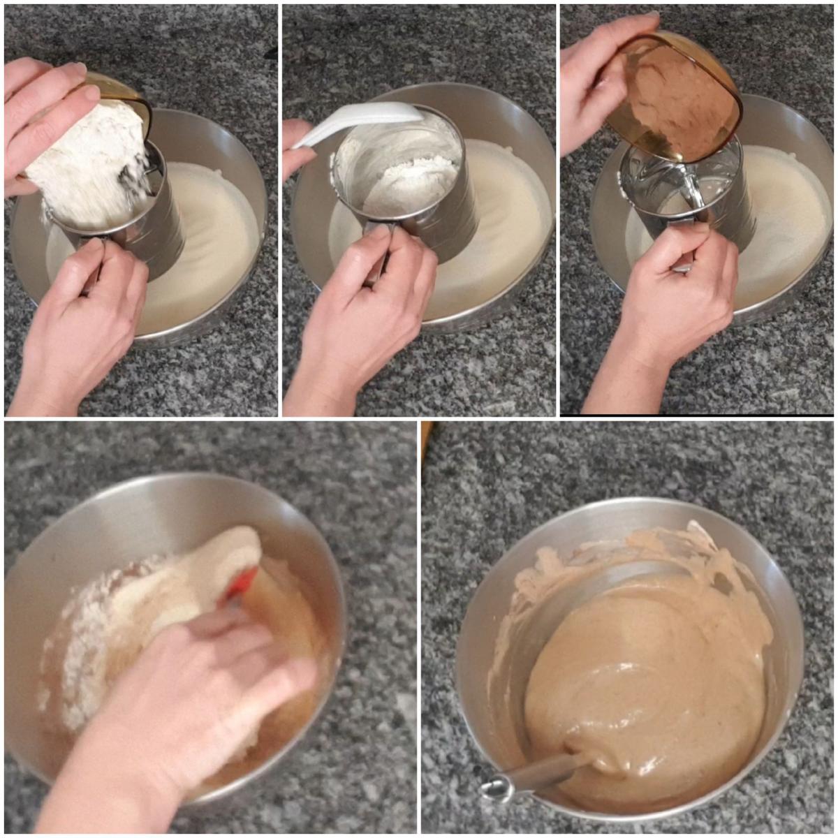 Añadimos los secos En el mismo bol de los huevos añadimos la harina con la sal y tamizamos, luego hacemos lo mismo con el cacao. Mezclamos bien con una espátula con movimientos envolventes. Hay que llegar bien al fondo del bol con la espátula para conseguir mezclar bien la harina.