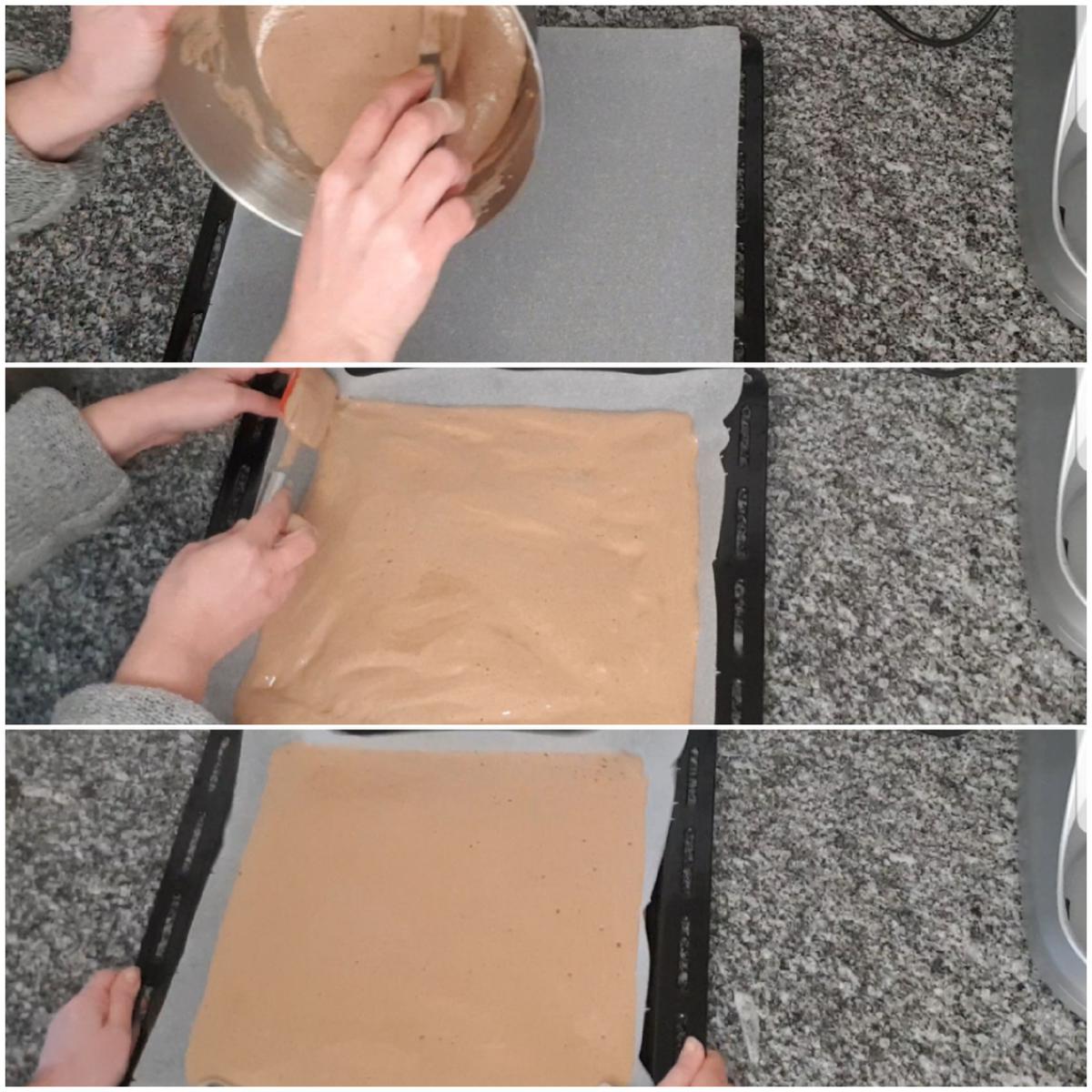 Hornear Vertemos la mezcla en los moldes o en mi caso en la bandeja del horno y horneamos a 180ºC durante 10 minutos. Si la masa es más gruesa por el tipo del molde duplicaremos el tiempo de horneado.