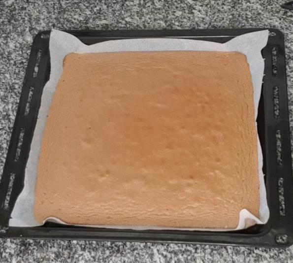 Deciros que el bizcocho, yo en mi caso lo he hecho en la bandeja del horno, porque quería un bizcocho muy fino, luego lo que hice es cortar dos círculos con el tamaño del molde que pensaba utilizar… lo que me ha sobrado del bizcocho, por supuesto, no lo he tirado… Cada vez que paso por la cocina cae un trozo ya lo que me faltaba…