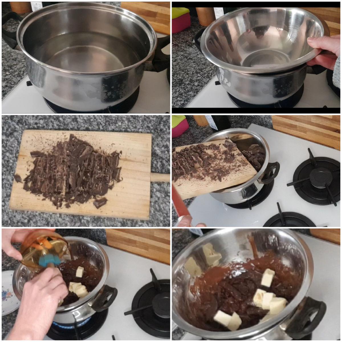 Derretir el chocolate Calentamos el chocolate al baño María, sobre una olla con agua caliente, ponemos un bol con el chocolate troceado. cuando empiece a derretirse le añadimos la mantequilla y dejamos a fuego medio hasta que se derrita por completo.