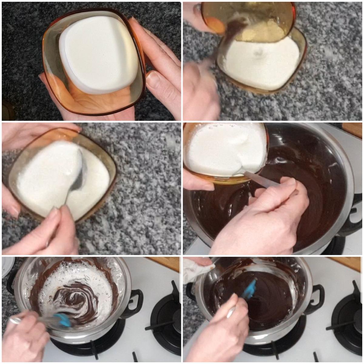 Disolver la gelatina Mientras se derrite la gelatina, calentamos los 50 ml de nata (crema de leche) en el microondas, que esté bien caliente y le añadimos la gelatina que ya estará hidratada y removemos hasta que se disuelva. le vertemos la nata (crema de leche) caliente al chocolate que ya se habrá derretido y mezclamos bien. Reservamos el chocolate para que le baje la temperatura.