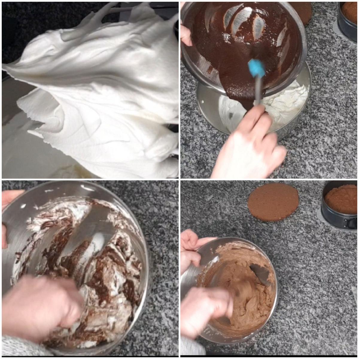 Hacer la mousse Montamos la nata (crema de leche) con el azúcar a velocidad media. Cuando tengamos la nata (crema de leche) bien firme, le añadiremos la ganache de chocolate que tiene que estar a temperatura ambiente y mezclamos bien hasta que quede uniforme.