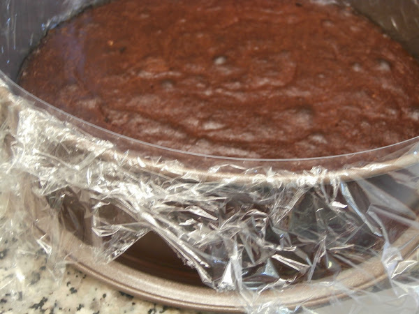 8.- Cuando el brownie se haya enfriado, forra el molde que has usado para hornearlo con film de plástico, que cubra la base y salga por los laterales (necesitarás cruzar dos trozos). Pon una tira de PVC de pastelería (como el que usamos para la fraisier) cubriendo todo el lateral del molde y ciérralo con un trozo de celo. El celo tiene que ir en el lado de fuera, pegado al molde