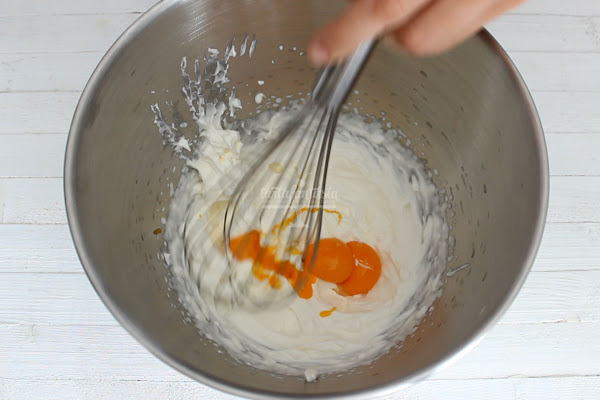 Batir la nata (crema de leche) hasta que esté firme y añadir las yemas removiendo suavemente.