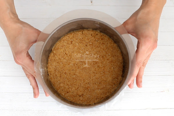 Poner la masa de galletas sobre la base del molde y presionar bien con ayuda de un vaso. Introducir el molde en el frigorífico o heladera mientras preparamos el resto de la receta.