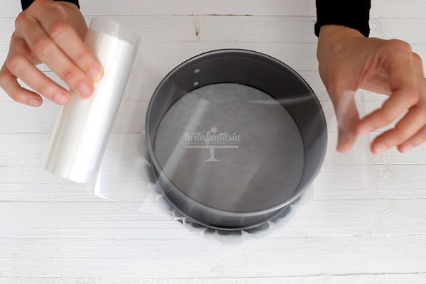 Empezamos preparando el molde de 18 cm de diámetro, lo desmontamos y ponemos papel de horno sobre la base, volvemos a montar el molde atrapando el papel entre la base y las paredes.
