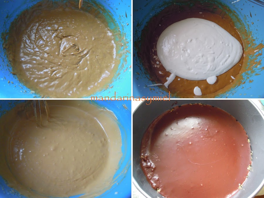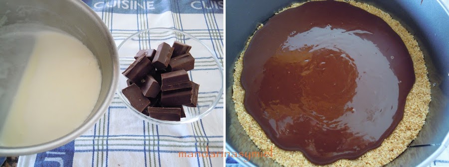Saca el molde de la nevera y echa por encima de la base el chocolate derretido, vuelve a guardar en la nevera mientras preparas la mousse.