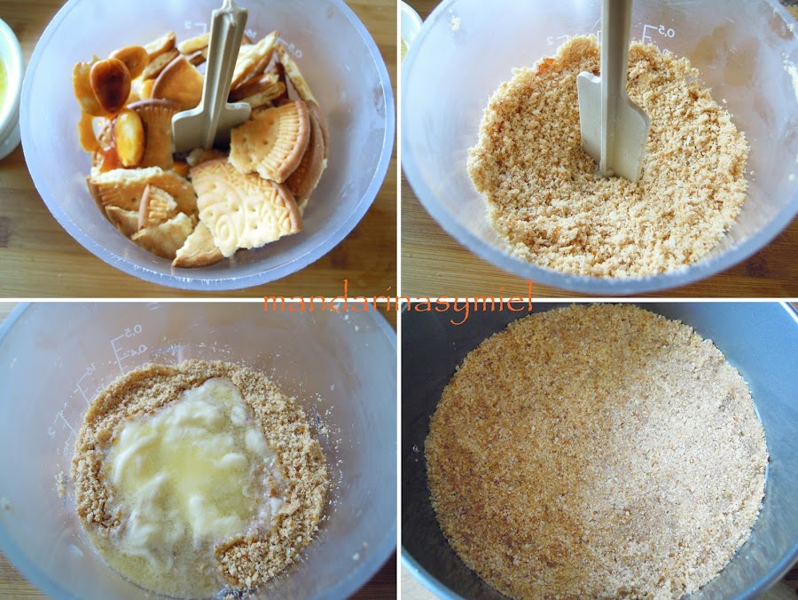 Pon la mezcla de galletas en un molde forrado con papel de horno para que te sea más fácil de sacar, aprieta bien hasta que quede una base uniforme. Reserva en la nevera.