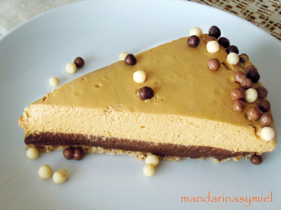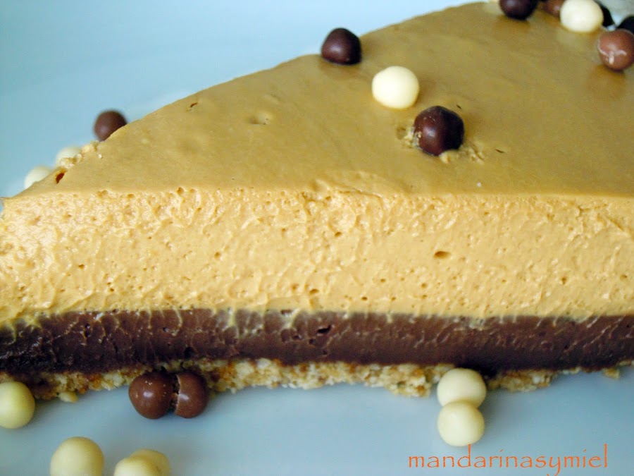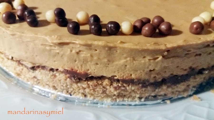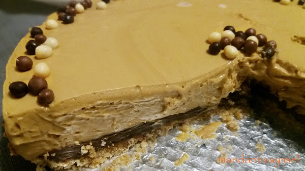 No suelo cambiar las recetas que asalto, pero esta vez he adaptado la tarta un poco a mi manera cambiando alguna cosa. La base de galletas he querido hacerla como me dijo una amiga, es una base que queda muy crujiente porque a las galletas y mantequilla le añadimos almendras caramelizadas. También le he añadido un poco de queso a la mousse porque la combinación con el dulce de leche y el chocolate me encanta!!