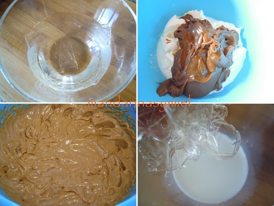 Calienta un poquito las dos cucharadas de leche, escurre las hojas de gelatina del agua, aprieta bien para que no quede agua y échalas en la leche, remueve hasta que se deshagan.