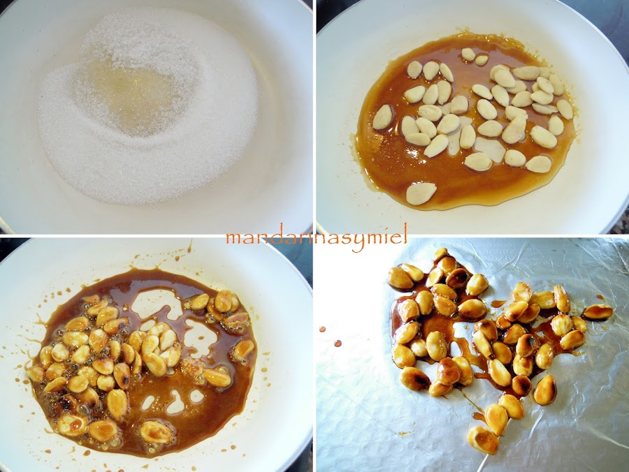 En una sartén pon el azúcar hasta que se haga caramelo claro, añade las almendras y remueve para que se impregnen bien del caramelo.