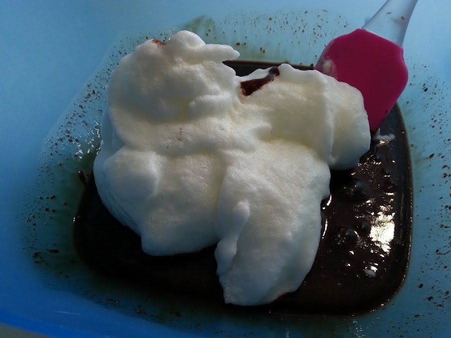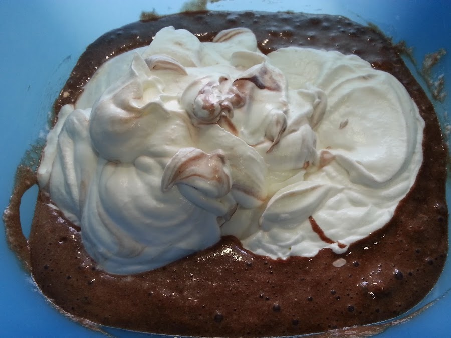 7. - Y por último montamos la nata (crema de leche) y la agregamos también. removiendo con cuidado, hasta que esté todo bien integrado.