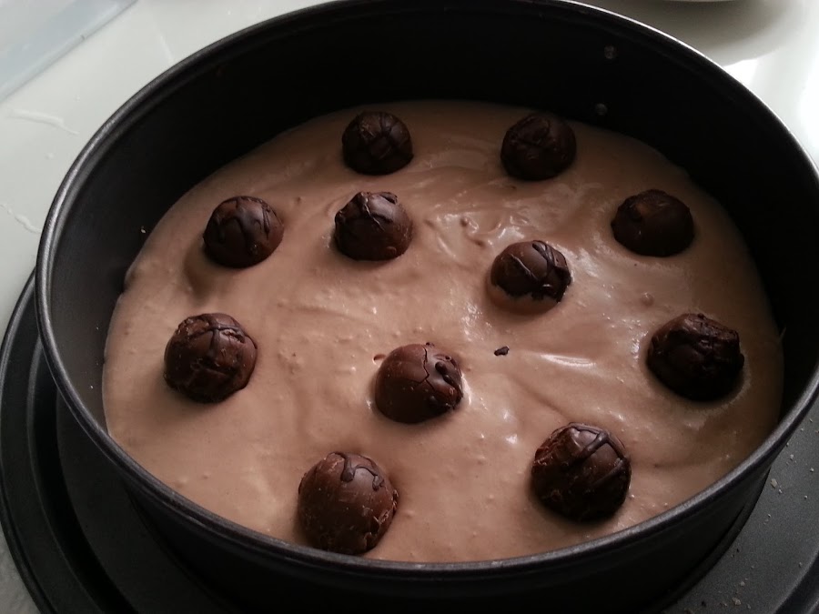 8. - Volcamos la mitad de la mezcla en el molde con la base de las galletas y colocamos los ferreros repartidos .