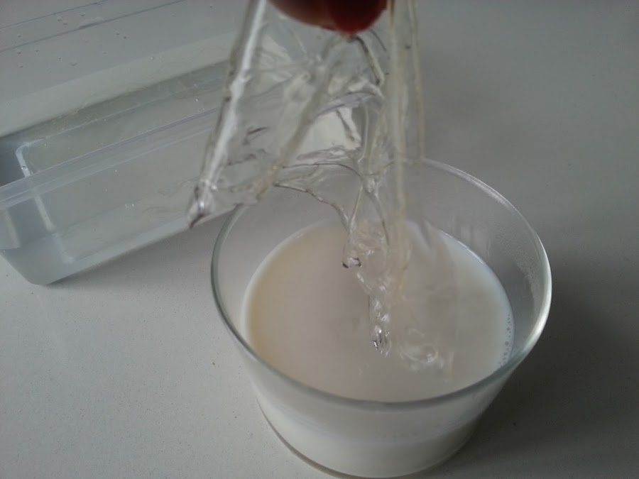 3. - Calentamos la leche en un cazo o en el microondas y le agregamos las hojas de gelatina, removiendo con una cuchara, para que se disuelva bien.