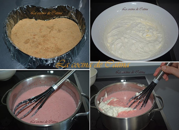 Preparamos la base triturando las galletas, derritiendo la mantequilla y mezclándolo hasta que quede una masa homogénea, y con ella cubrimos el fondo del molde.