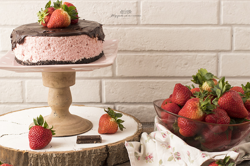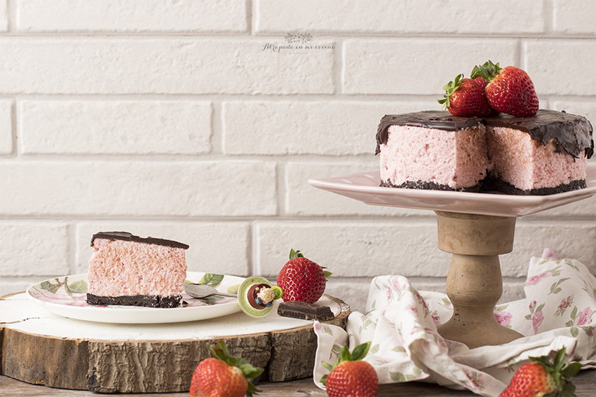 Desde hace unos meses las fresas están de plena temporada, deliciosas y ricas, ideales para todo tipo de postres y para tomarlas solas, sin más. Una de mis frutas preferidas y que más juego dan en la cocina. En esta ocasión he querido preparar una tarta de mousse de fresas y cobertura de chocolate, una mezcla que siempre triunfa. Es una tarta sencilla y sin mucho artificio, pero que queda ligera y suave. La base la he preparado con galletas tipo Oreo, y la cobertura con chocolate negro, pero podéis ponerle chocolate con leche, o chocolate blanco, seguro que también queda genial.
