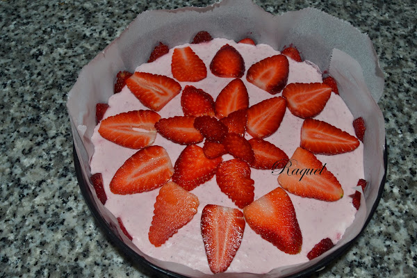 Cortamos unas fresas para decorar la tarta y las vamos colocando encima de la mousse.