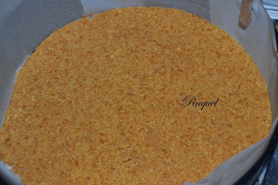 Trituramos las galletas hasta que estén bien trituradas y le añadimos la mantequilla que habremos derretido en el microondas, lo mezclamos bien y lo extendemos en la base del molde que quede bien compacto, después lo metemos en la nevera.