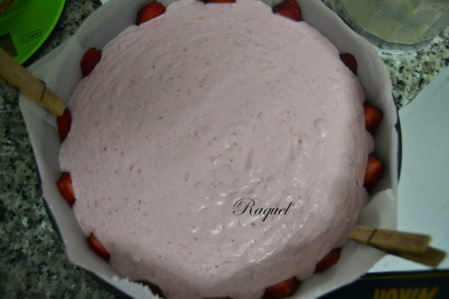 Añadimos la la mousse con cuidado que no se muevan las fresas y alisamos un poco por encima.