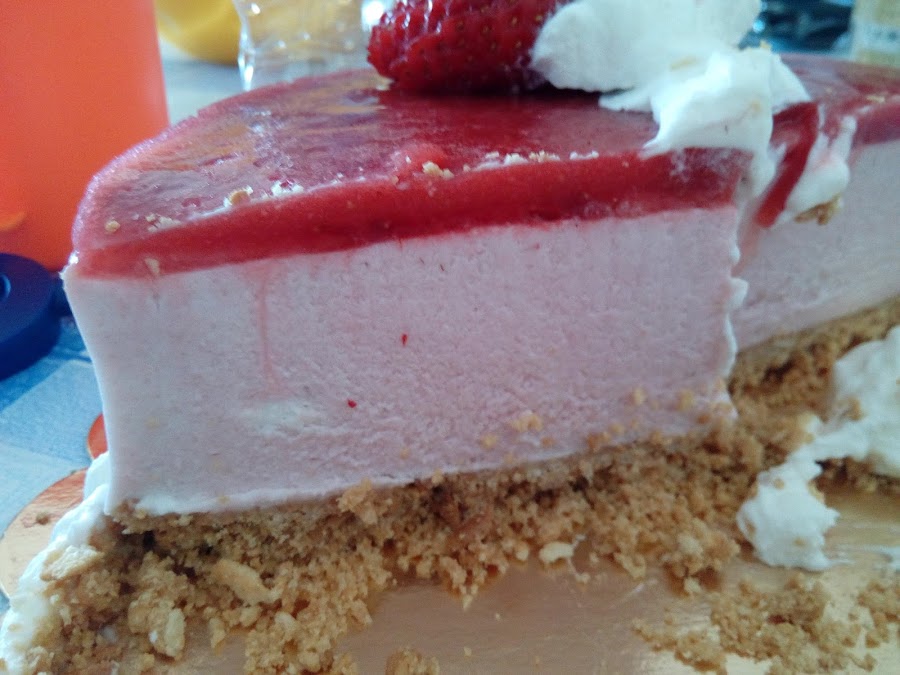 Dejamos enfriar y una vez casi fria, vertemos sobre la mousse de fresas suavemente para que se distribuya bien por toda la tarta.