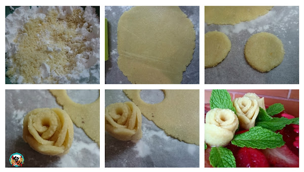 6.-Preparamos las rosas: En un bol mezclamos todos los ingredientes para hacer el mazapán, lo amasamos y formamos una bola con el mazapán. Extendemos sobre papel de horno cubierto por un poco de azúcar glas y extendemos la masa. Con un vaso pequeño (de chupitos) o un aro pequeño del mismo tamaño cortamos círculos, extraemos 7 por cada rosa. Volvemos a unir la masa si es necesario y repetimos la operación hasta acabar con el mazapán.