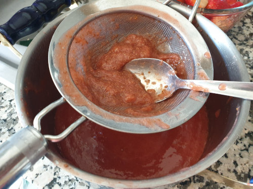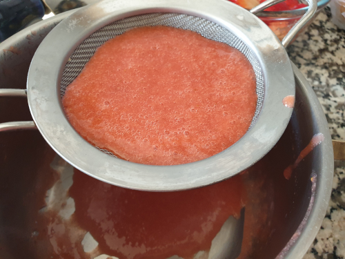 - Al cabo de los 10 minutos apagamos el fuego, agregamos el zumo del limón y la gelatina hidratada. Removemos para que se mezcle bien y pasamos la mezcla por un pasapuréspara eliminar el granillo de la fresa.