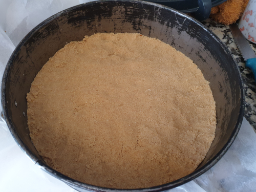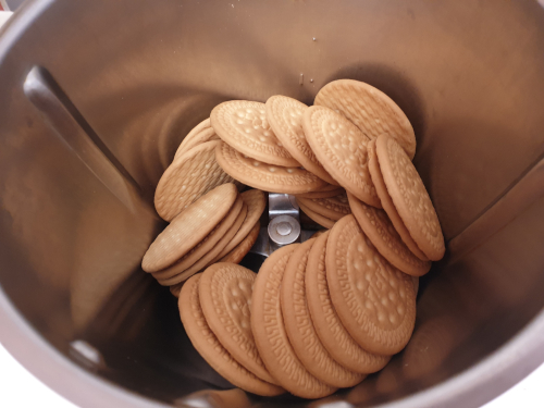 - Preparamos la masa de galleta, triturando las galletas