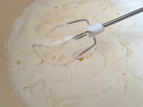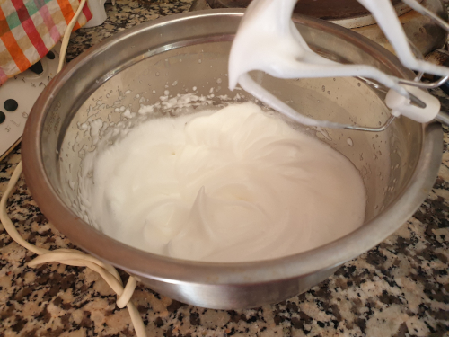 - Inmediatamente montamos las claras con el pizco de sal en un robot o con varillas eléctricas a velocidad alta.