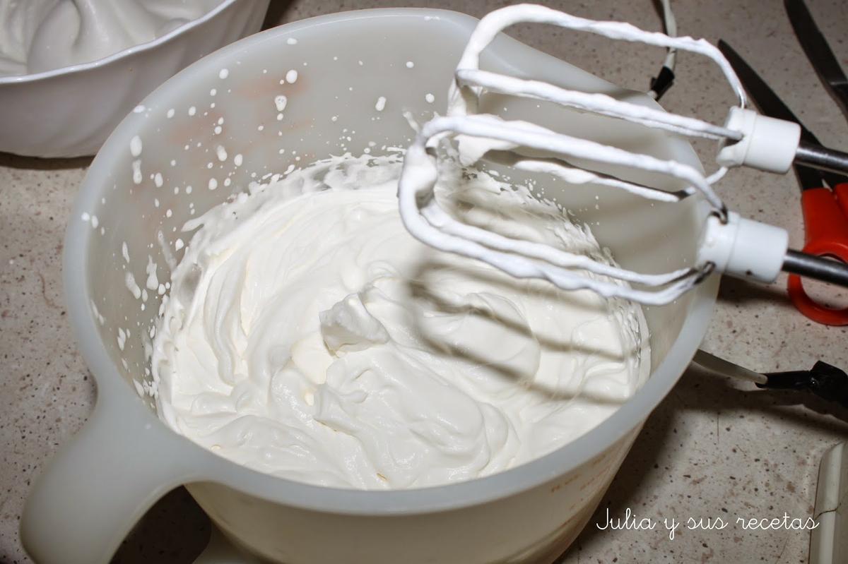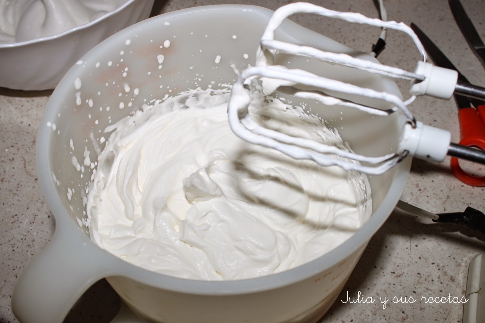Mezclamos la nata (crema de leche) con la leche condensada poco a poco y una vez mezclado bien vamos añadiendo las claras y mezclando con movimientos envolventes.