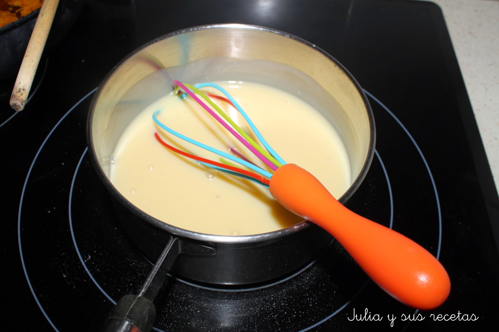 Ponemos la leche condensada con la cuatro cucharadas de agua al fuego hasta que se caliente pero que no hierva, le añadimos la gelatina escurrida y la movemos para mezclarla bien. Dejamos que se temple (casi fría).