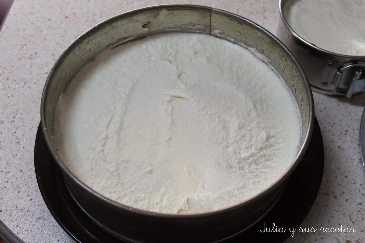 Primero hacemos el bizcocho como dice la receta en un molde apto para microondas. Lo dejamos enfriar y lo ponemos en un molde desmontable.