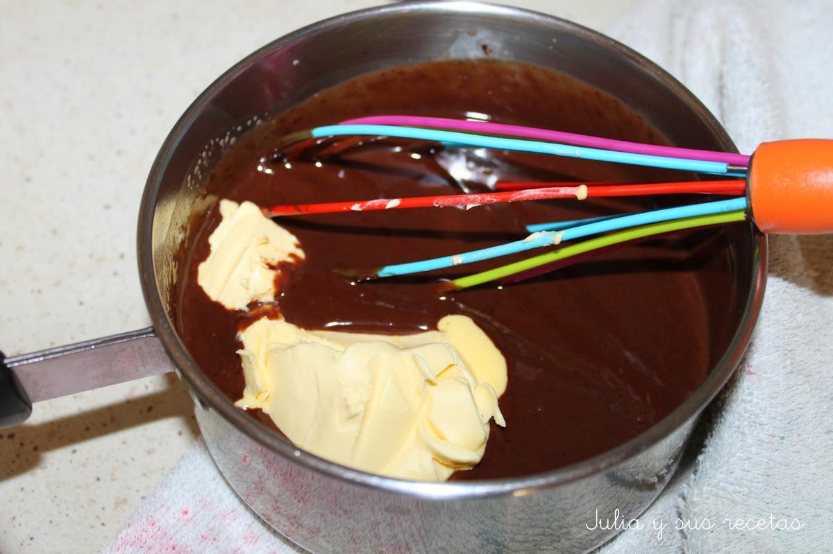 Hacemos la ganaché de chocolate poniendo la nata (crema de leche) y el chocolate a fuego lento hasta que se derrita el chocolate, moviendolo constantemente. Lo retiramos del fuego y añadimos la margarina.